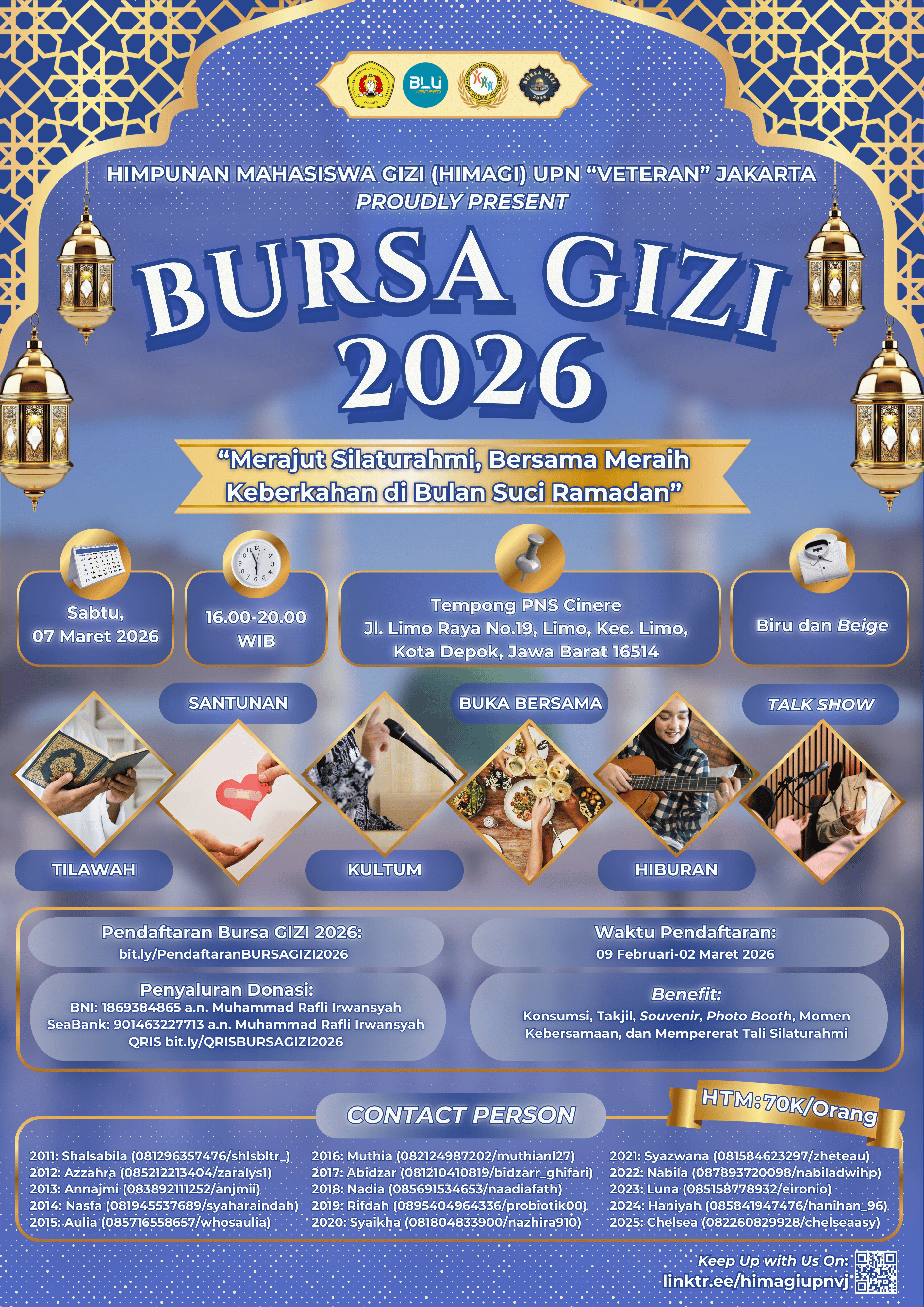 BURSA GIZI 2026 merupakan kegiatan yang diselenggarakan oleh Divisi Humas Himpunan Mahasiswa Gizi (HIMAGI) Fakultas Ilmu Kesehatan Universitas Pembangunan Nasional “Veteran” Jakarta. Kegiatan ini bertujuan untuk mempererat kebersamaan dan tali silaturahmi serta meningkatkan keimanan seluruh keluarga besar Program Studi Gizi Program Sarjana Fakultas Ilmu Kesehatan Universitas Pembangunan Nasional “Veteran” Jakarta. Selain itu, kegiatan ini juga bertujuan untuk memeriahkan bulan suci Ramadan dengan menumbuhkan semangat berbagi dan memperbanyak amal saleh melalui kegiatan berbagi kepada teman-teman panti asuhan.